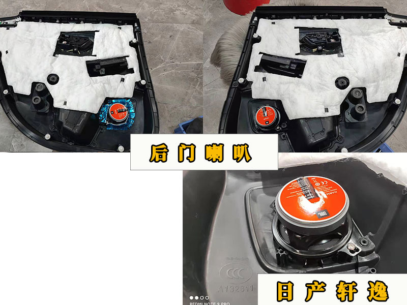 接下來是第二第三層隔音,第二層是密封車門的作用,確保門板不漏音,軒逸的后門是有一個中音喇叭的,在門皮上面,而四個中低音分別在前門和后平臺。安裝效果如上圖所示。都是更換專車專用的喇叭墊,焊線上螺絲就可以了。