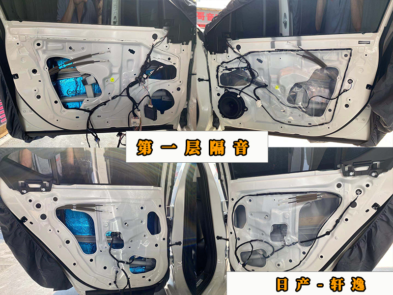 這邊是第一層隔音,主要是增加門板厚度減少共振。右邊是原車的門板狀態(tài),可以看到軒逸的后門是沒(méi)有喇叭的,但為了整車的效果還是得把隔音給做了。