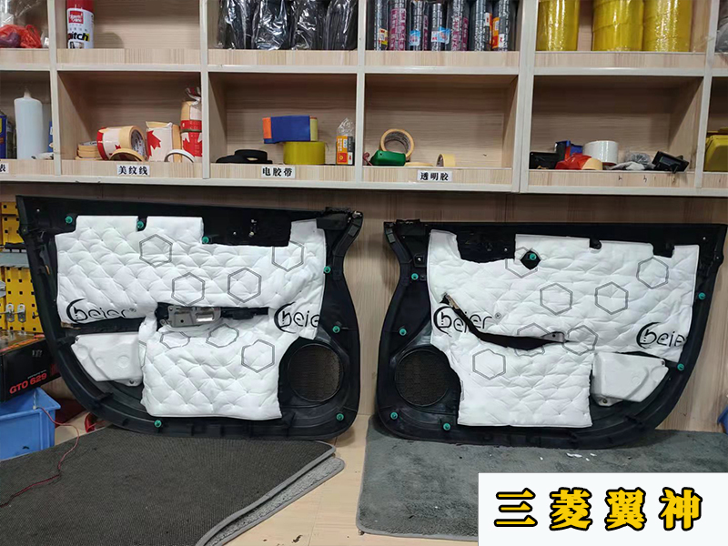 既然要升級(jí)音響,那么原車的隔音也是有必要做一下的。原車的門板拆開之后就只是一層薄薄的防水膜,是沒有隔音作用的。這里是貼了第一層隔音,增加門板的厚度。減少共振