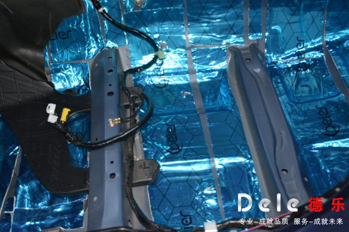底盤隔音 拆開地盤內(nèi)飾 第一層貼上貝爾藍(lán)膜止震板,減小底盤震動頻率;第二層鋪上貝爾吸音王,吸收進(jìn)入駕駛室的小部分噪音。