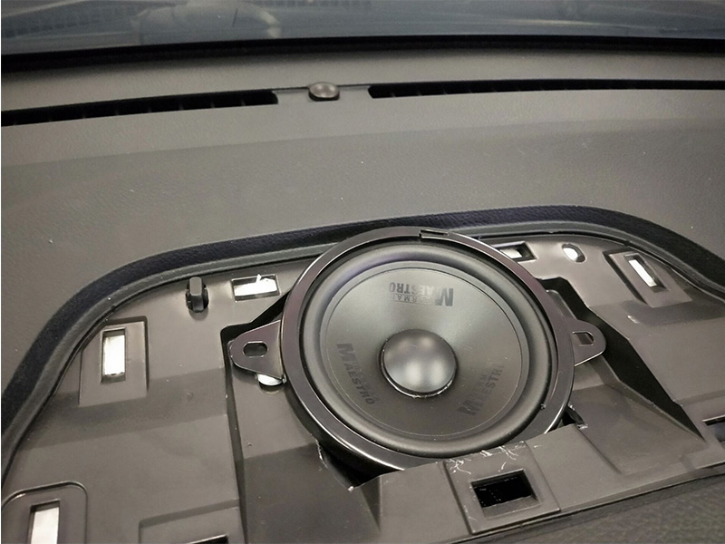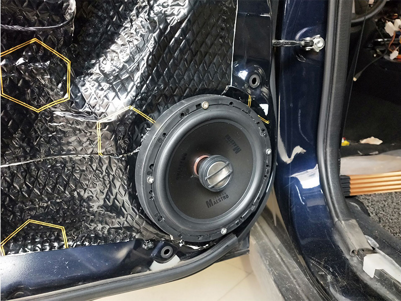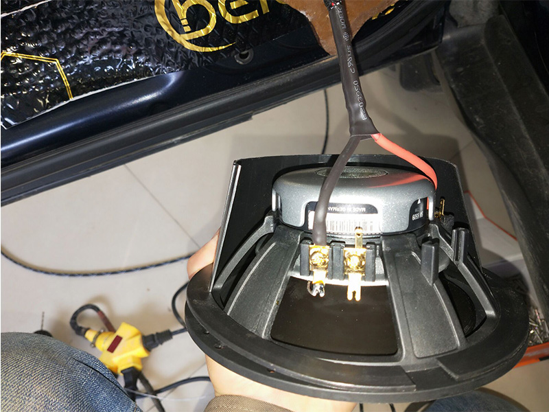 隔音施工完成后,改裝技師開始進(jìn)行喇叭安裝。改裝技師先在原車?yán)鹊奈恢霉潭ê美戎Ъ埽又N上防震的喇叭墊圈然后接線,把喇叭固定上去。前門采用曼斯特SV6509套裝喇叭,憑借材料精選以及出色設(shè)計,聲音細(xì)膩動聽,動態(tài)效果好,給人身臨其境的感覺。