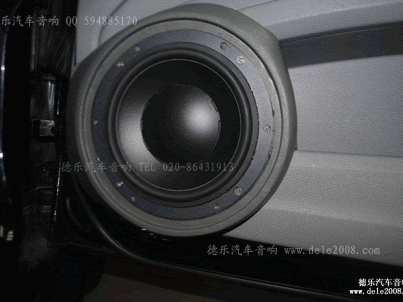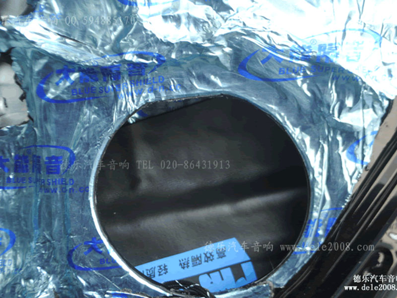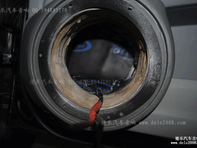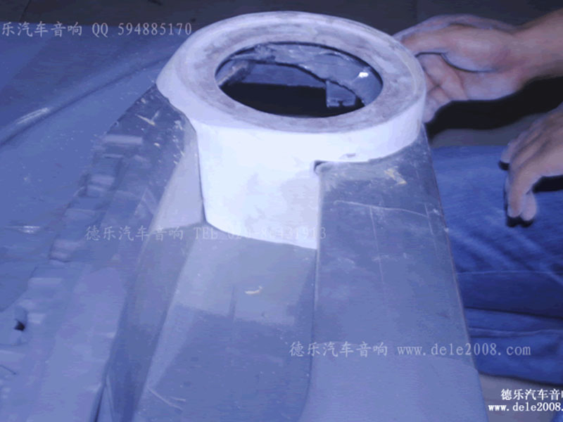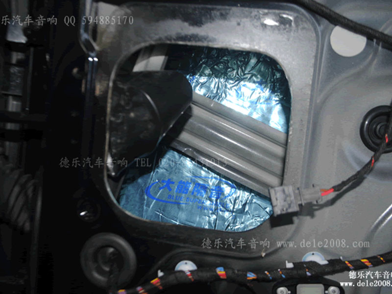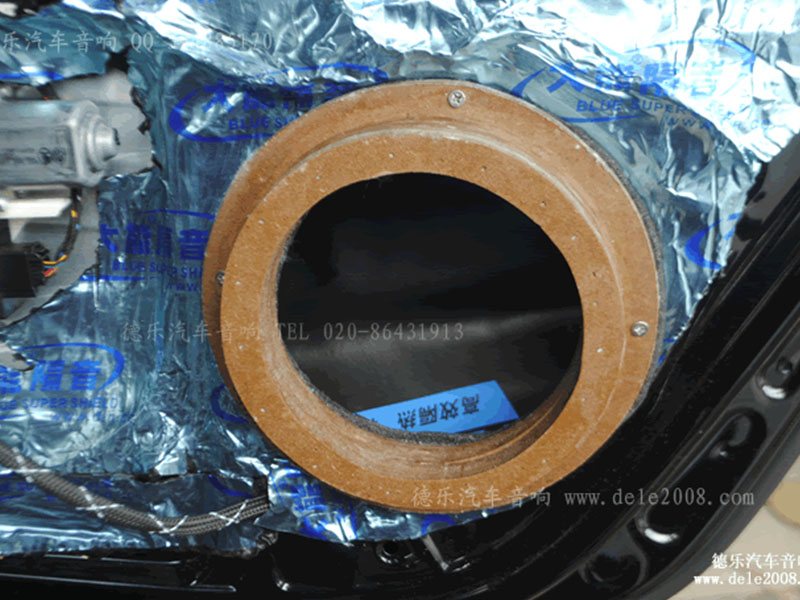 由于昊銳原車前門喇叭位置比較靠后,使得駕駛座和副駕位上的聲場并不是很好,因此前門喇叭進行倒膜,把喇叭往前移動,聲場變得更加自然