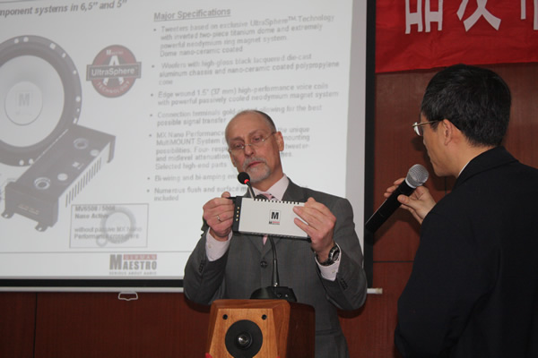 另外會議邀請了德國原MB QUART的總經(jīng)理Thomas Sauer和NXS公司亞太區(qū)經(jīng)理Paul Seow,做了精彩的演講。德國MAESTRO總經(jīng)理Thomas Sauer詮釋了MB QUART和MAESTRO這二個商標(biāo)的品牌關(guān)聯(lián),并表示MAESTRO將會充分體現(xiàn)其品牌價值,繼續(xù)保留德國制作工藝。會議現(xiàn)場展示了MAESTRO的全系列新品,Thomas Sauer解釋了MAESTRO其產(chǎn)品系列命名的含義,并演示了在MB QUART原有高音專利技術(shù)上提升而成的新的專利技術(shù)“Mega Sphere”和“Ultra Sphere”的性能表現(xiàn),其360度的頻率指向性,震撼了所有與會人員。